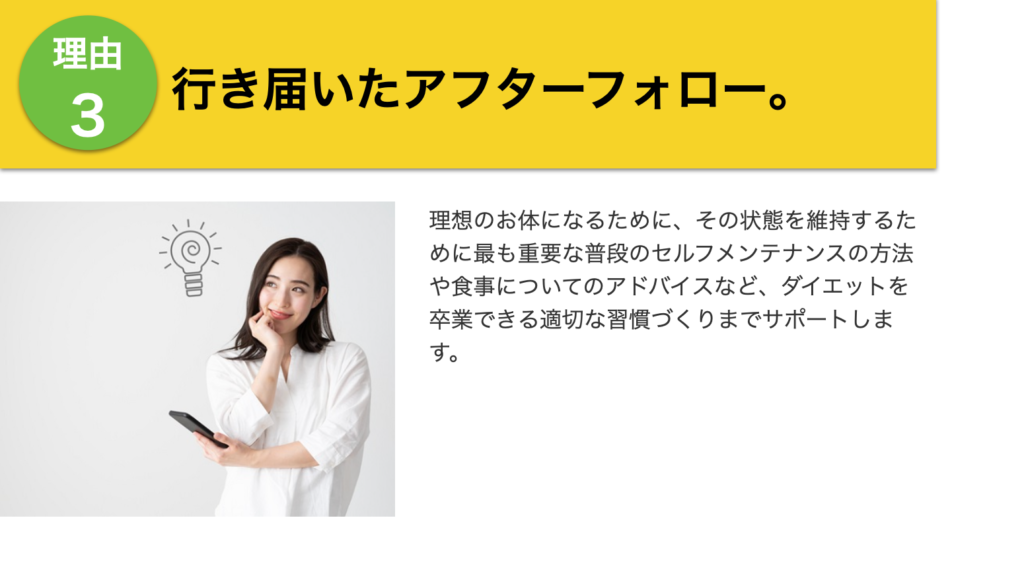 一時的で小手先のテクニックとは違い、食事の選ぶ基準が身に付くことで今後の生涯で役に立ち、あなたの「在りたい自分」に見合う食習慣を作れるようにサポートします。