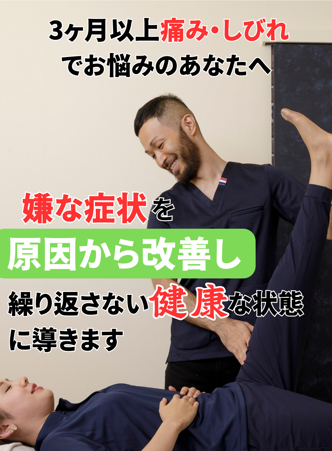 膝痛、腰痛、坐骨神経痛、四十肩などの痛みの症状は、筋肉が固まった状態です。この「筋肉が固まった原因」を改善することが根本改善に繋がります。